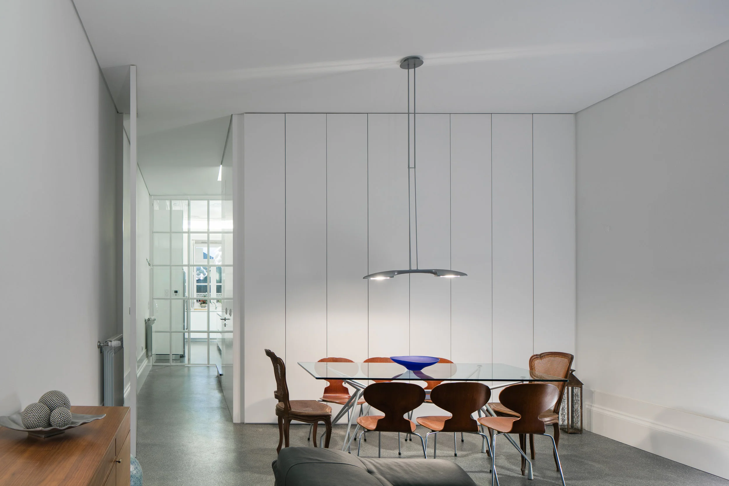 The ground floor was in a very poor state of conservation, so it suffered a major transformation in terms of constructive elements and spatial organization. Maintaining its social function, it assumes a distinctly contemporary language which is materialized in wide and bright spaces, with full-height doors and panels. Stand out the doors built with iron and glass between the kitchen and the living room, which increase the passage of light through the spaces and make their relationship more fluid.