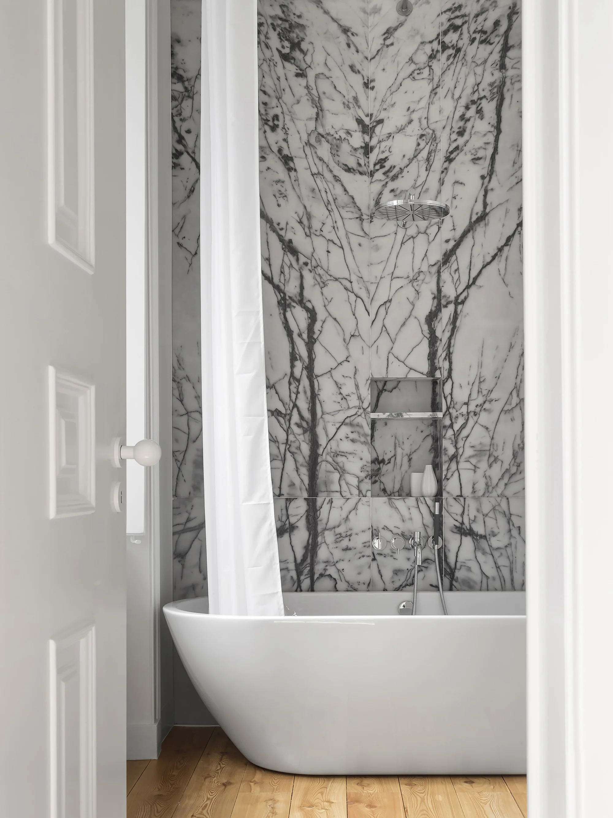 A intervenção mais profunda foi feita nas casas de banho, redesenhadas estruturalmente de forma a melhor se adequarem à disposição dos espaços. Destacam-se os elementos construídos e revestidos a mármores portugueses rosa e pele de tigre, contrastando com o tom minimal do resto da casa. Na cozinha eliminaram-se características que a desqualificavam, resultado de intervenções passadas, e preservaram-se os azulejos oitocentistas originais e o móvel de arrumação superior, agora restaurado.