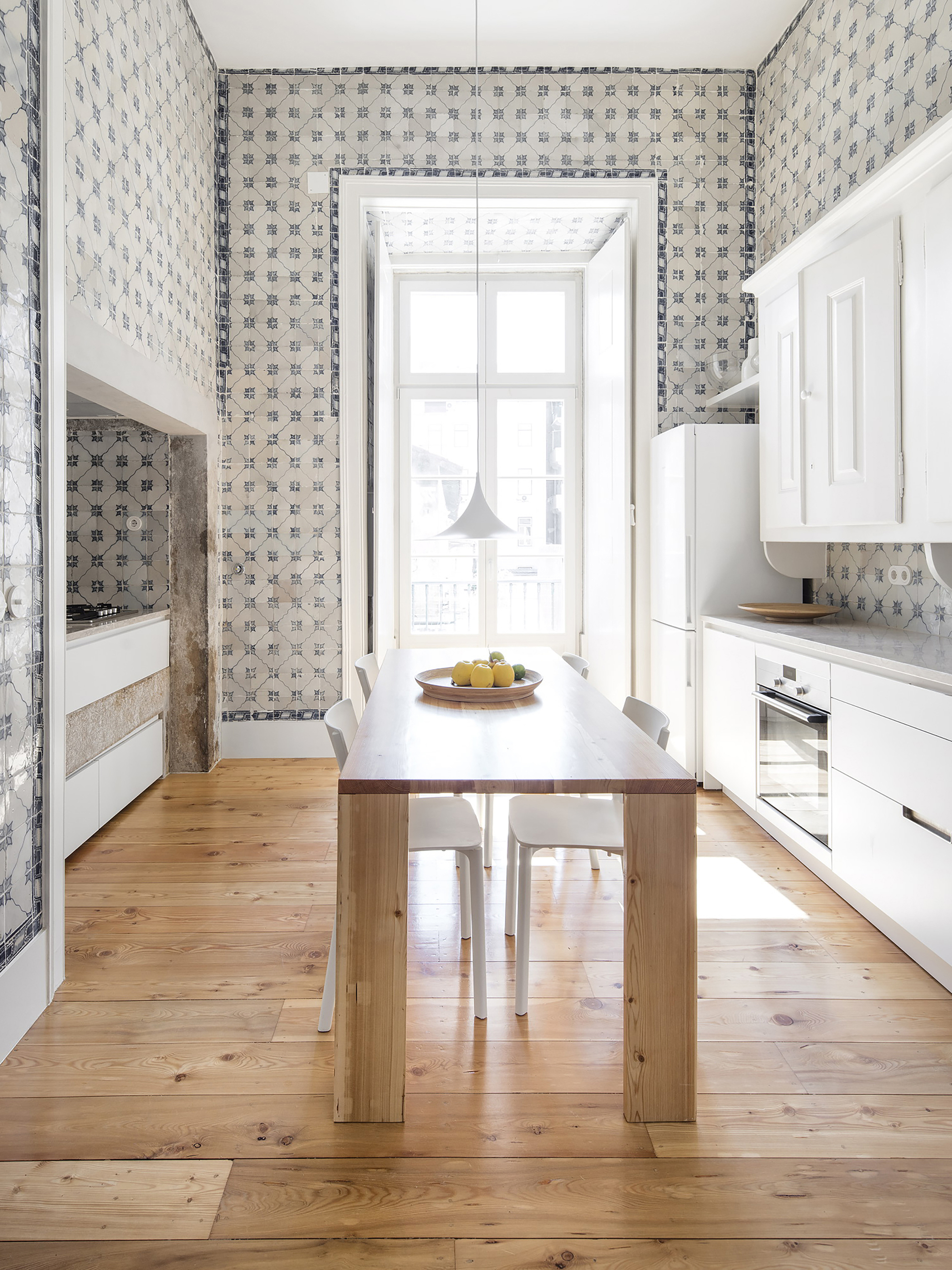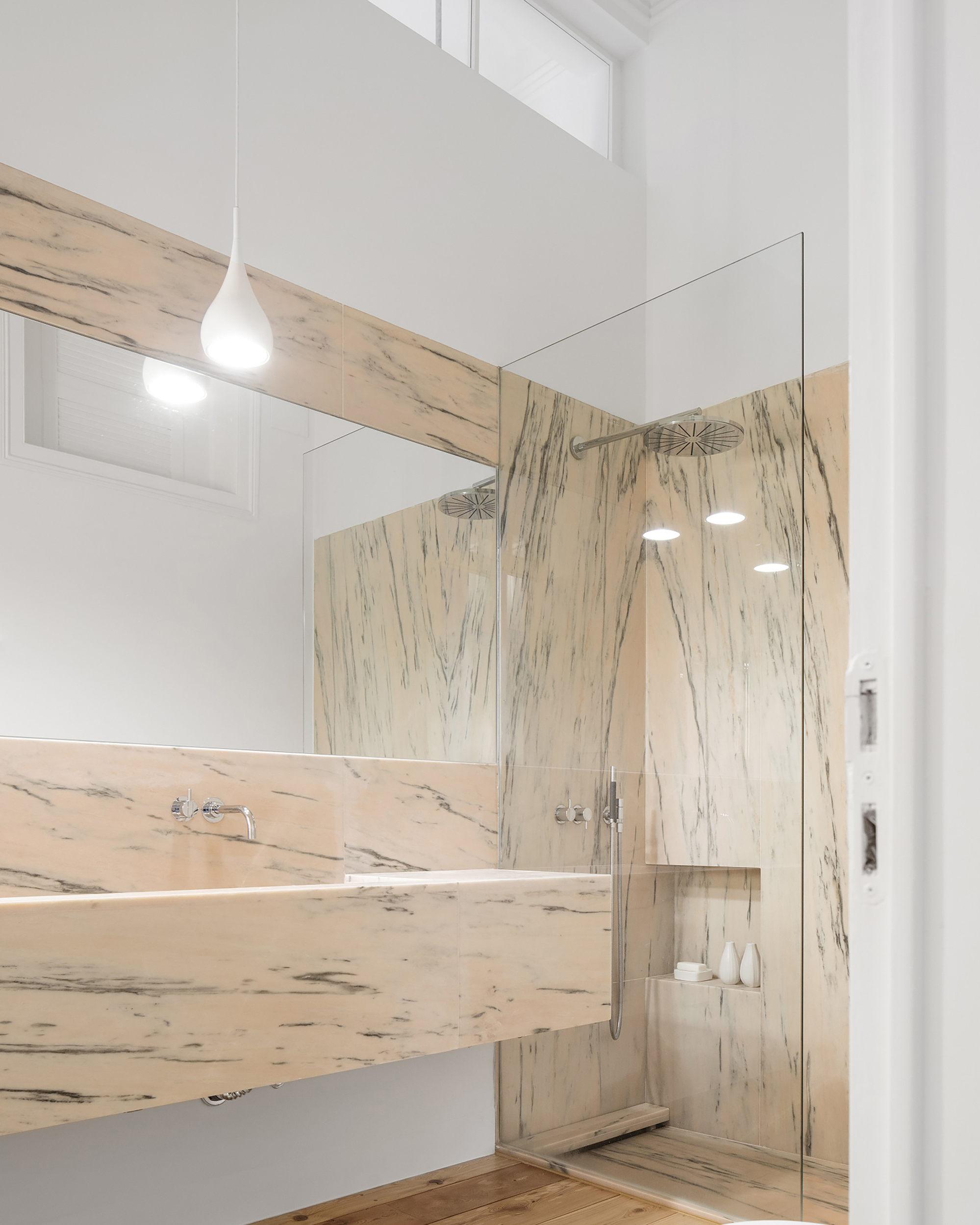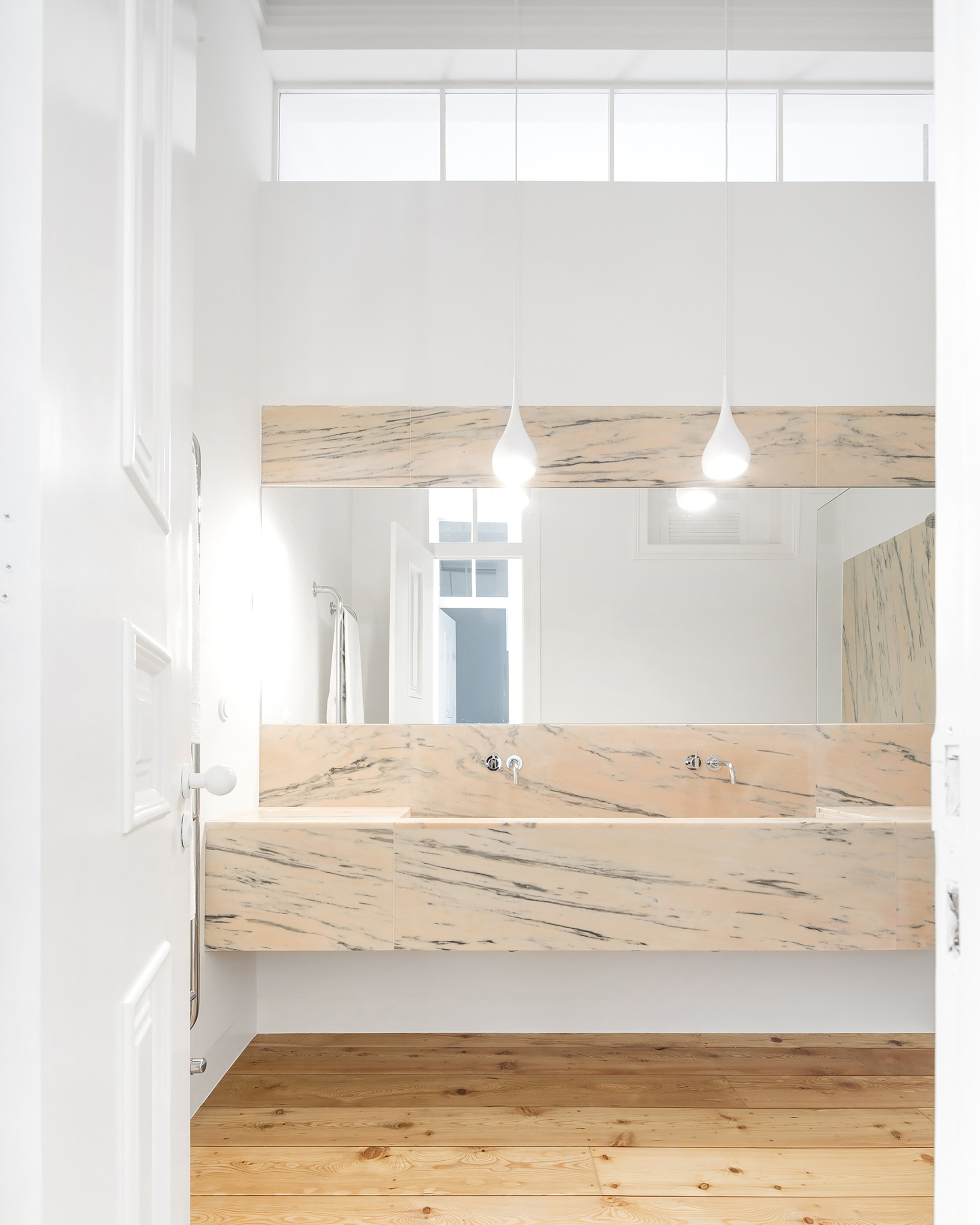 The deepest intervention was made in the bathrooms, structurally redesigned to better fit the layout of the spaces. Noteworthy are the elements constructed and coated with Portuguese pink and tiger skin marbles, contrasting with the minimal tone of the rest of the house. In the kitchen, disqualifying features, result of past interventions, were removed, while preserving the original 19th century tiles and the upper storage cabinet, now restored.