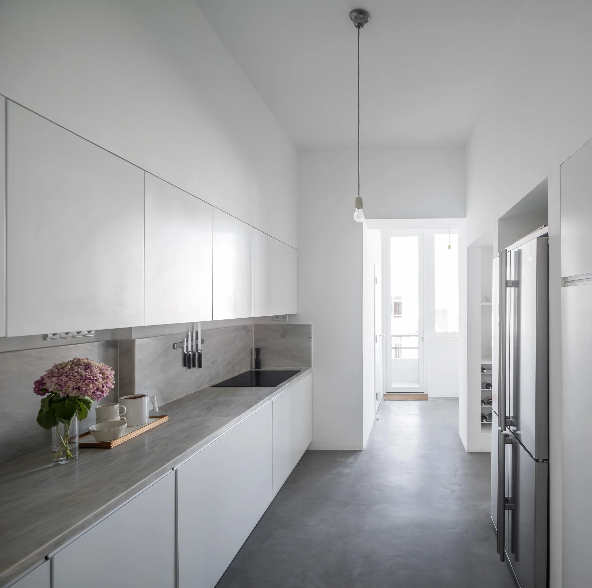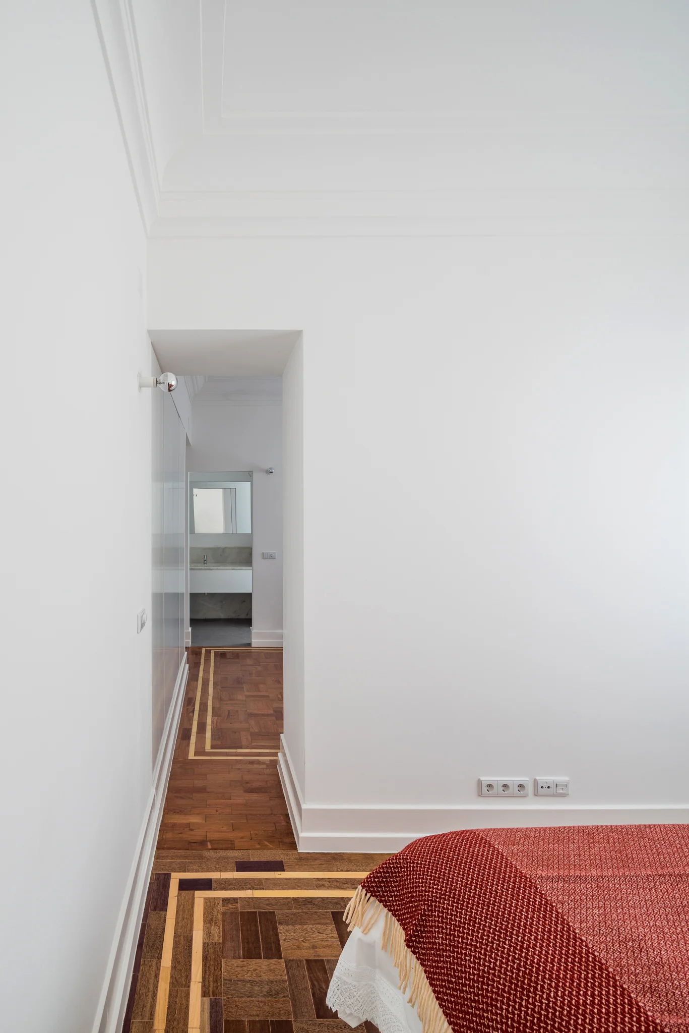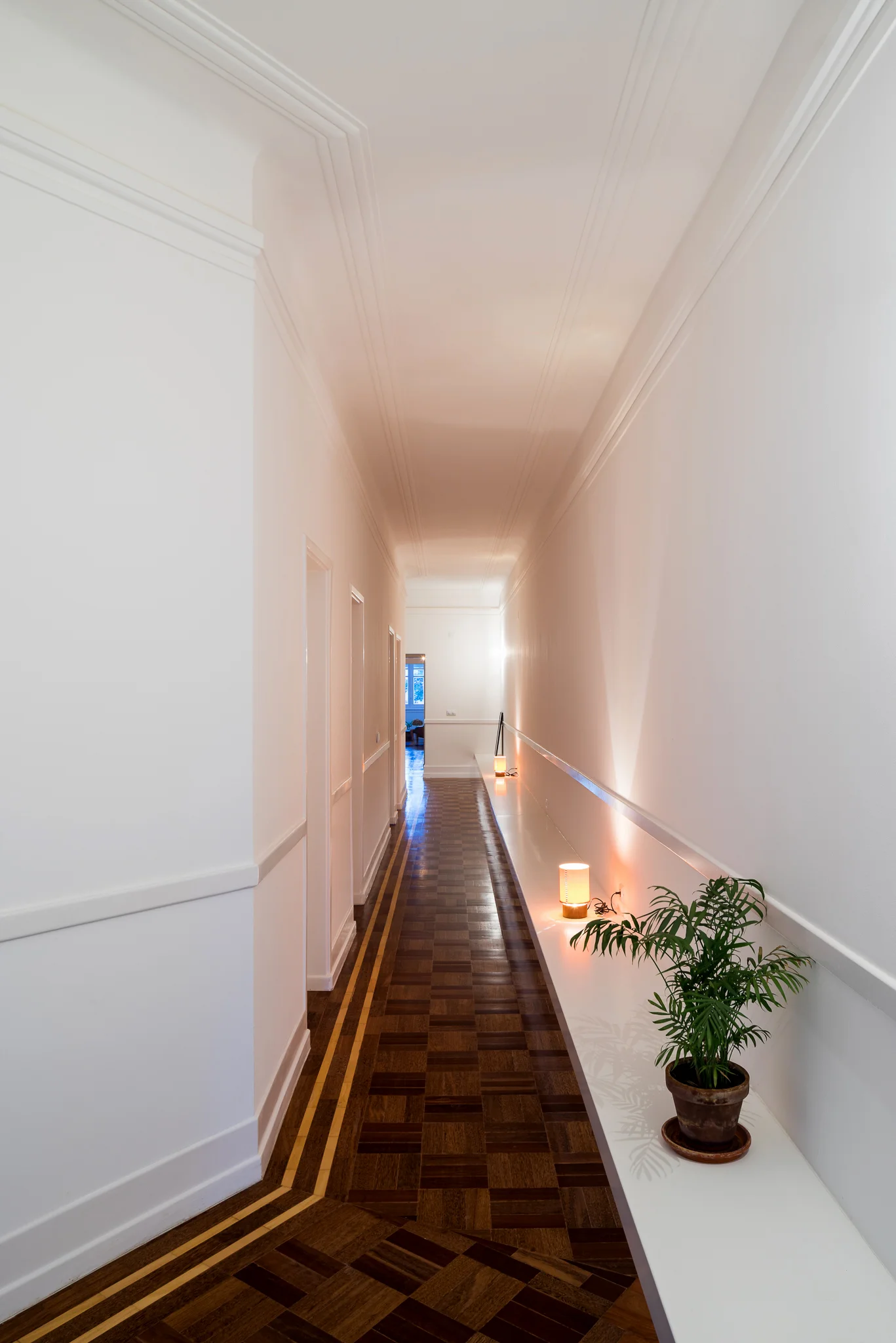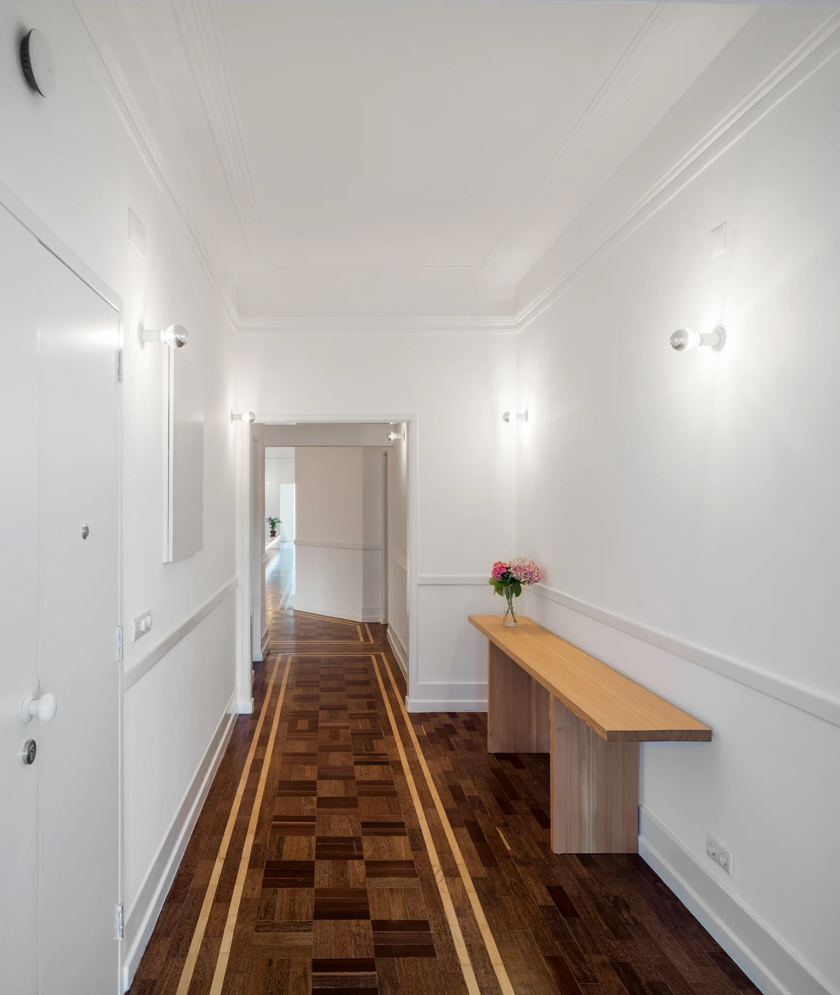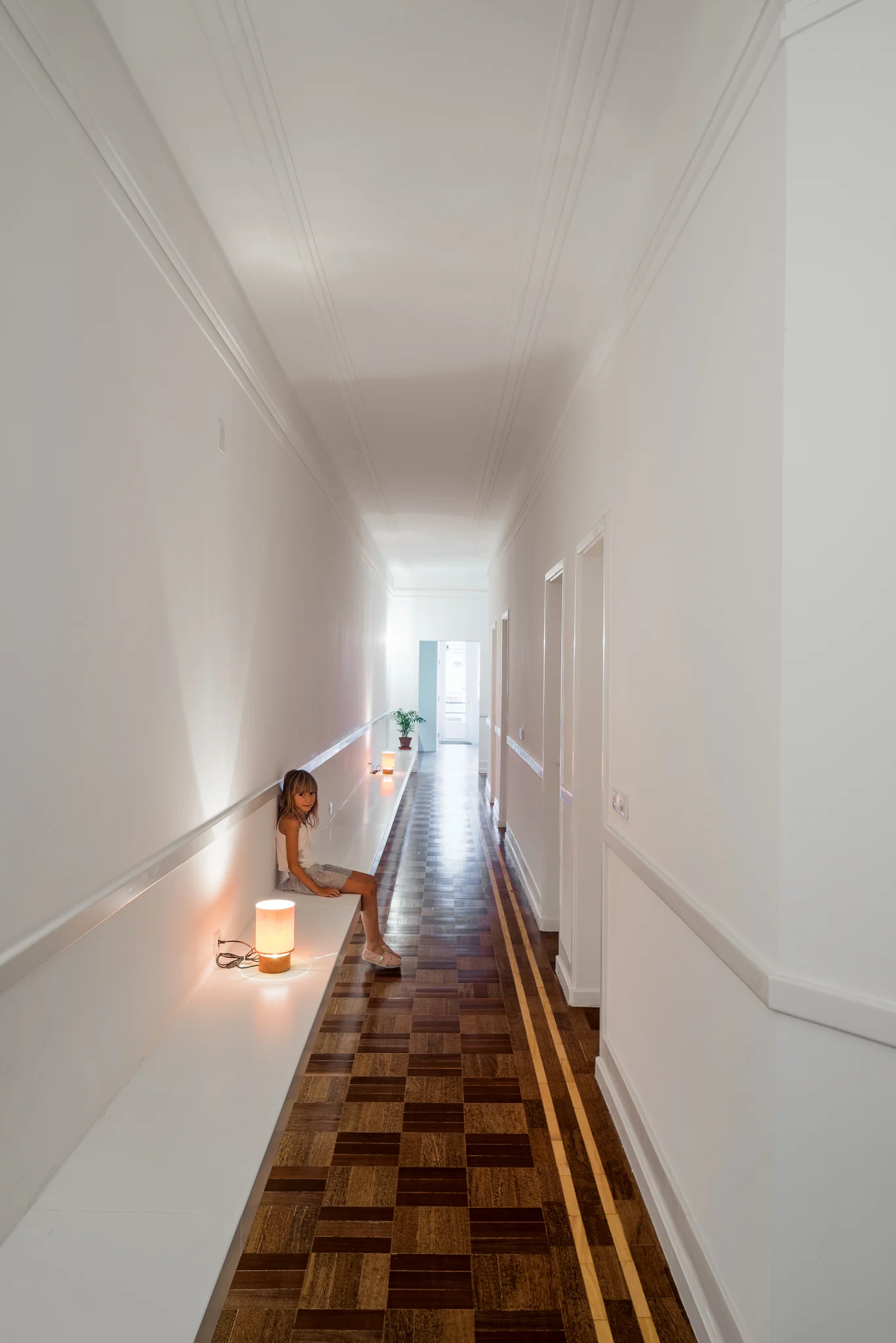 O extenso corredor, antes um espaço escuro, torna-se o elemento central da subtil mas completa transformação do apartamento. A colocação de um banco ao longo dos seus 15 metros de profundidade reforça o seu carácter, convidando à sua utilização como espaço habitável e não apenas de circulação.