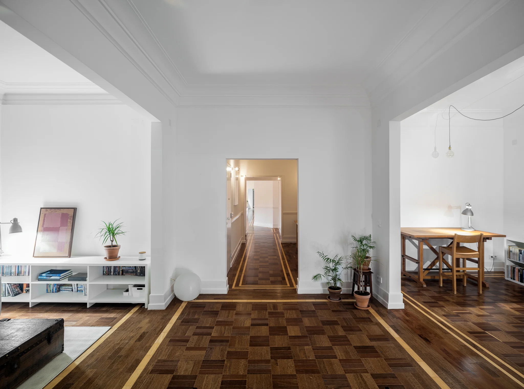 The long corridor, once a dark space, becomes the central element of the apartment's subtle but complete transformation. The placement of a bench along its 15 metres long reinforces its character, adding a dwelling quality to what was formerly an exclusive circulation space.
