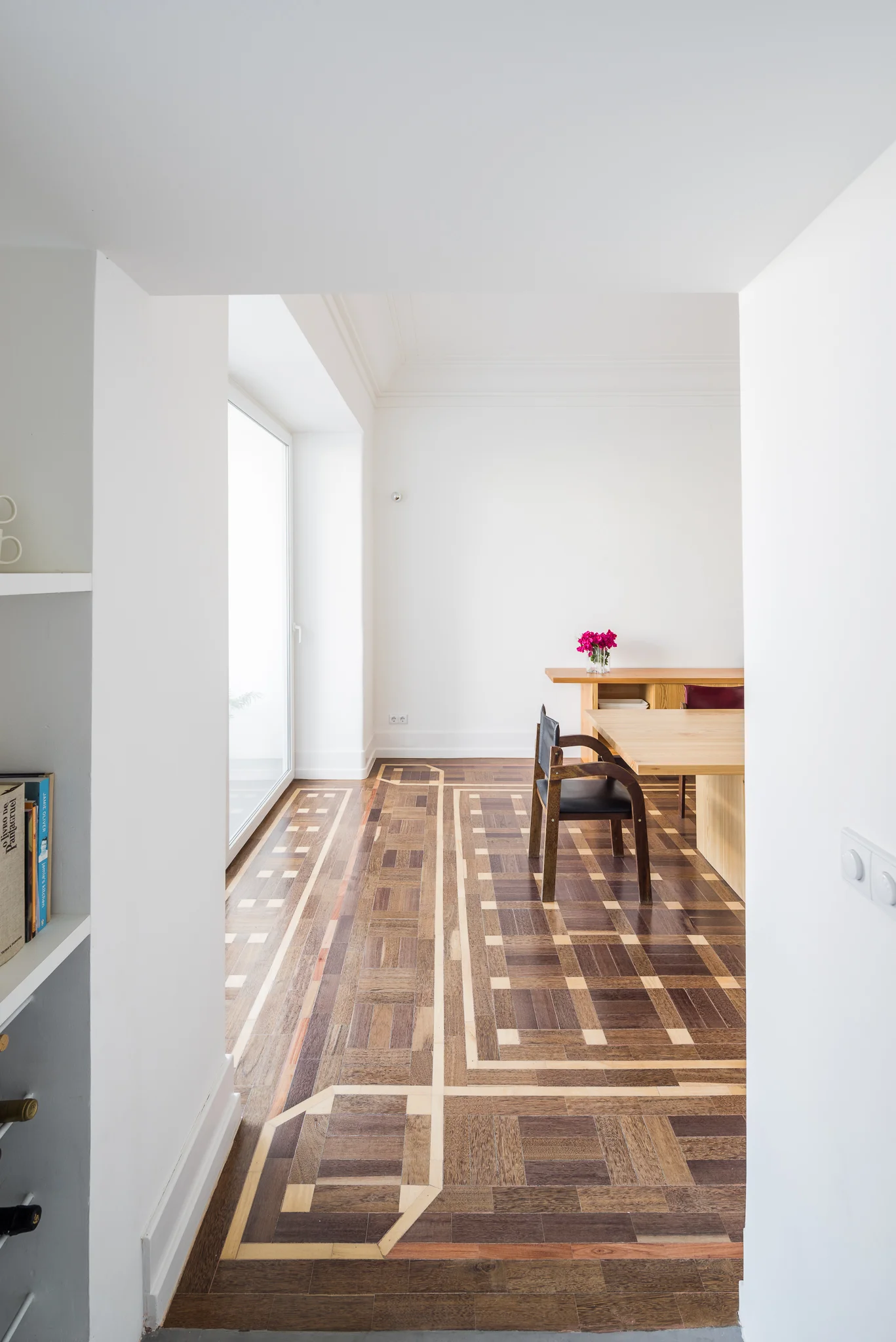 A visual connection is established between the living room and the kitchen, with the latter left somewhat hidden, and the dining room gains a balcony and more natural light. The desired permeability of the spaces is further reinforced with the removal of some doors.